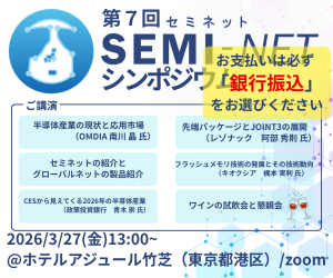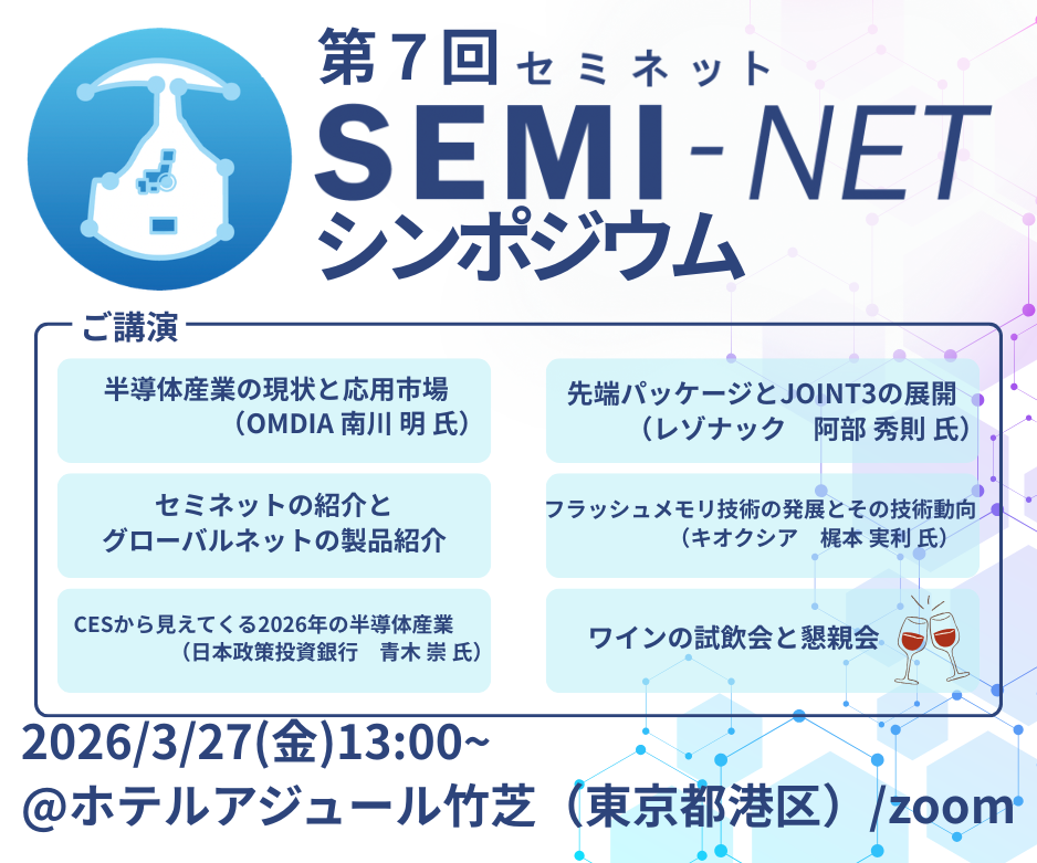【開催日時】2026年3月27日(金)13:00~18:30 【開催場所】ホテルアジュール竹芝(東京都港区) 【申し込み方法】semi-net ECより「semi-net シンポジウム2026」を会場orオンラインでご注文。支払い方法は『銀行振込』をご選択ください。 【お申し込みはこちら】https://semi-net.com/ec/item/6996b85051940 !!!必ず、「銀行振込」をご選択ください!!!2026/02/19 グローバルネット 株式会社