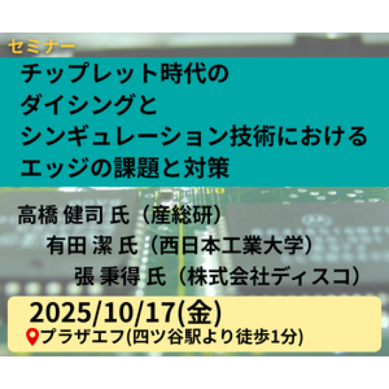 時間 セミナー内容(一部変更する場合がございます) 13:05〜14:05 「先端パッケージのチップレット時代のエッジの課題と解決策(仮)」 講師:高橋 健司 氏(国立研究開発法人産業技術総合研究所) 14:05〜15:35 「先端パッケージのプラズマダイシング技術(仮)」 講師:有田 潔 氏(西日本工業大学) 15:35〜15:50 休憩 15:50〜16:50 「チップレットパッケージのダイシング課題と改善への取り組み」 講師:張 秉得 氏(株式会社ディスコ) Chipletパッケージでのダイシング課題 ・Particle/バリ/チッピング/デラミ/チップ形状 ダイシング手法別のダイシング課題 ・ブレードダイシング/プラズマダイシング/ステルスレーザダイシング/レーザフルカット 課題解決に向けての取り組み紹介