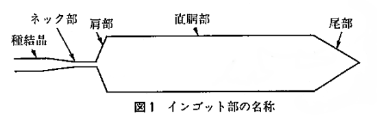 半導体用Si単結晶のインゴットは、無転位結晶を作る必要性から、いくつかのプロセスを経て成長させる。たとえばCZ法の場合、石英るつぼ内で溶融された多結晶シリコンを単結晶成長に最適な温度に調整した後、初めに、単結晶の種結晶を融液に浸す。この時、急激な熱衝撃を受けるために、種結晶先端部には、転移が発生する。無転移成長させるためには、この転移を除去する必要があり、Dash法とも呼ばれる方法で、ネック部を形成し、無転移化する。その後、種結晶の引き上げ速度と融液温度を制御しながら、徐々に直径を大きくしてゆく。この過程で、肩部が形成される。
