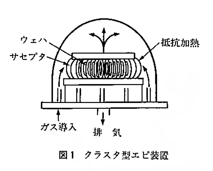 本装置の構造は図1に示したようにウェハを保持するサセプタが垂直・放射状に配置され、このサセプタの上下に加熱用のヒータが配置されている。加熱はこのヒータによる抵抗加熱および石英ベルジャ外部の赤外線ランプからの輻射で実施する。ウェハの大量処理は可能であるが、膜厚均一化に大量の水素ガスが必要、電力消費量が大きいなどチャージ枚数の割にランニングコストが高く、また、反応炉が複雑で構成部品が多いため装置の維持管理の負担が大きいなど、コスト低減は必ずしも十分実現されてはいないようである。