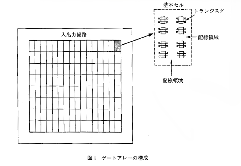 図1に示すように、トランジスタ(および抵抗)と、配線領域から構成される基本セルを二次元に配置し、周辺に入出力回路用トランジスタ(および抵抗)を付加した基板を共通に用意しておき、配線のみの設計により種々の LSIを実現する方法。フルカスタム設計と比較して、設計工数の大幅な削減が図れるが、トランジスタの使用効率が100%ではないため集積度は劣る。ゲート回路が構成しやすいようにトランジスタの数が決められている。化合物半導体電子デバイスについては、GaAs MESFETあるいはGaAs HEMTを用いたものが開発され、 GaAs HBTを用いたものの研究報告がなされている。FET系では低消費電力化に適したDCFLゲートを基本としたものが多い。0.6µmゲートHEMTを用いた基本遅延時間35psの45kゲートアレーが開発されている。HBTではECLゲートが使用され消費電力制限のためゲート数は1kに留まっている。応用例として、スーパーコンピュータのプロセッサ、通信用LSI、コンピュータ間通信用データ送受信LSIなどがあげられる。