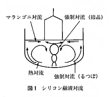 CZ法によるシリコン単結晶引き上げ時の融液中には、温度差によって発生する熱対流、るつぼ回転や結晶回転による慣性力によって発生する強制対流、表面張力の不均一によって発生するマランゴニ対流の3種類の対流が存在する。