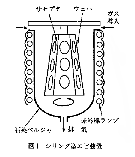エピタキシャル成長装置の一種。バレル型ともいう。図1に示すように、ウェハは石英製のベルジャ内部に設置された多角錘台状のサセプタ(ウェハ保持台)にほぼ垂直保持され、ベルジャ外部に設置されたハロゲンランプにより輻射加熱される。サセプタは10rpm程度で回転しており、ウェハの均熱、ガス流均一化を図っている。原料ガスとしては厚膜成長には、主にSiCl₄、SiHCl₃、薄膜成長にはSiH₂Cl₂が用いられる。SiH₄では反応管内壁への反応生成物の堆積、いわゆるウォールデポが起こるため、本装置では使用されない。大型化により、150mm⌀で21枚、200mm⌀で10枚までウェハが載置可能となっているが、主に150mm⌀までの生産に使用されている。200mm⌀以上の大口径ウェハに対しては、枚葉エピタキシャル装置が主流になりつつある。