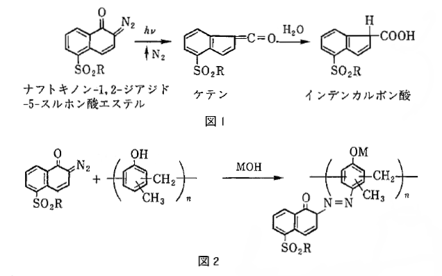 ナフトキノン感光剤はフェノール樹脂と混合することにより溶解禁止剤として働き、フェノール樹脂のアルカリに対する溶解速度を低下させる。このナフトキノン感光剤に光照射すると、ジアゾ基が脱離し中間体ケテンを経た後、水と反応してインデンカルボン酸を生成する(図1反応式参照)。このインデンカルボン酸はアルカリに溶解しやすく、また溶解促進効果を持つため、フェノール樹脂のアルカリに対する溶解速度を向上させる。これらの性質をポジ型レジストでは利用している。