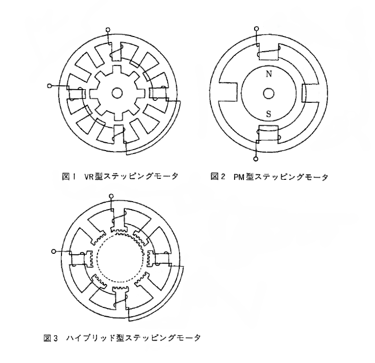構造的に分類するとVR(Variable Reluctance)型(図1)、PM(Permanent Magnet)型(図2)およびハイブリッド型(図3)の3種類がある。VR型はロータ(回転子)として透磁率が高い鉄心を用い、駆動コイルを巻線したステータ(固定子)の歯と若千の位置をずらした位置に置かれた構造を持っている(実際には図のように、ロータ側とステータ側の歯数を変えてある)。ステータ側の駆動コイルに電流を流し、磁化することによりロータを回転させるが、回転角により磁気抵抗が変わるのが特徴である。PM型はロータとして永久磁石を利用しており、ハイブリッド型は両者を兼ね備えた構造を持っている。