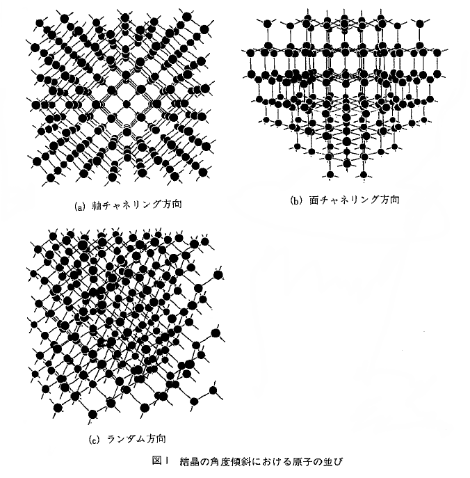 結晶中に、加速されたイオンが突入する際に、格子が整列して配置しているために、結晶の隙間に沿って衝突を起こすことなく、深いところまで侵入する。チャネリングが発生するための結晶方向との角度が1から2度のイオンにより異なったクリティカルアングルが存在する。チャネリングが起こると、制御性が損なわれるために、これを防止することが必要である。そのために表面に酸化膜などの非結晶の膜を通して注入することが行われる。結晶へのイオン注入時には、軸チャネリング、面チャネリングの二つの種類のチャネリングがある。それぞれの一例を図1に示す。(a)の軸チャネリングは、結晶に垂直にイオン注入する場合に結晶に沿って深く侵入する現象である。(b)の面チャネリングは、結晶面から軸方向に傾けた場合の結晶の一つの面に沿って深く侵入する現象を示す。(c)はランダム方向であり、最もイオンの侵入が浅くなる方向である。通常シリコン結晶では、(100) 面を上にして(110)から22.5度回転(45度おきに対称な状態となる)させて、7度傾けた方向から注入する場合が最もチャネリングの抑えられるランダム方向となる。