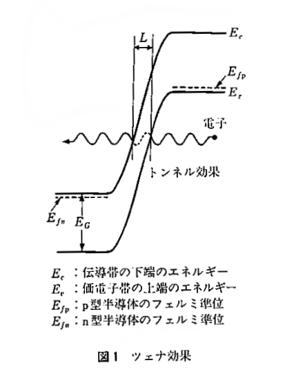 高い不純物密度からなるpn接合に逆バイアスを印加すると図1に示すようなエネルギー帯図となり、禁制帯幅Lが極端に狭くなる。この場合は、充満体の電子はトンネル効果(「トンネル効果」の項参照)によって伝導帯へ直接移ることが可能になる。このため逆方向電流が電子なだれ降伏の場合と同じように急激に増加する。このように、トンネル効果という量子効果によって生じる降伏現象は1934年ツェナによって初めて明らかにされたのでツェナ降伏と呼ばれる。