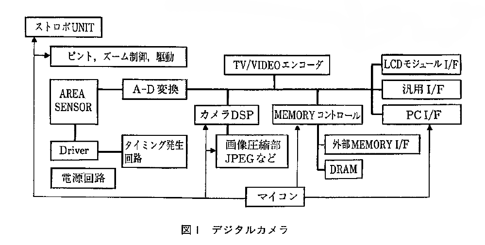 上述のほとんどのデジタルカメラは、半導体という観点からみると共通な部品が多く、画像処理用のDSP部と画像を格納するメモリやテープが用途によって違うだけとなっており、構成は以下のようになる。