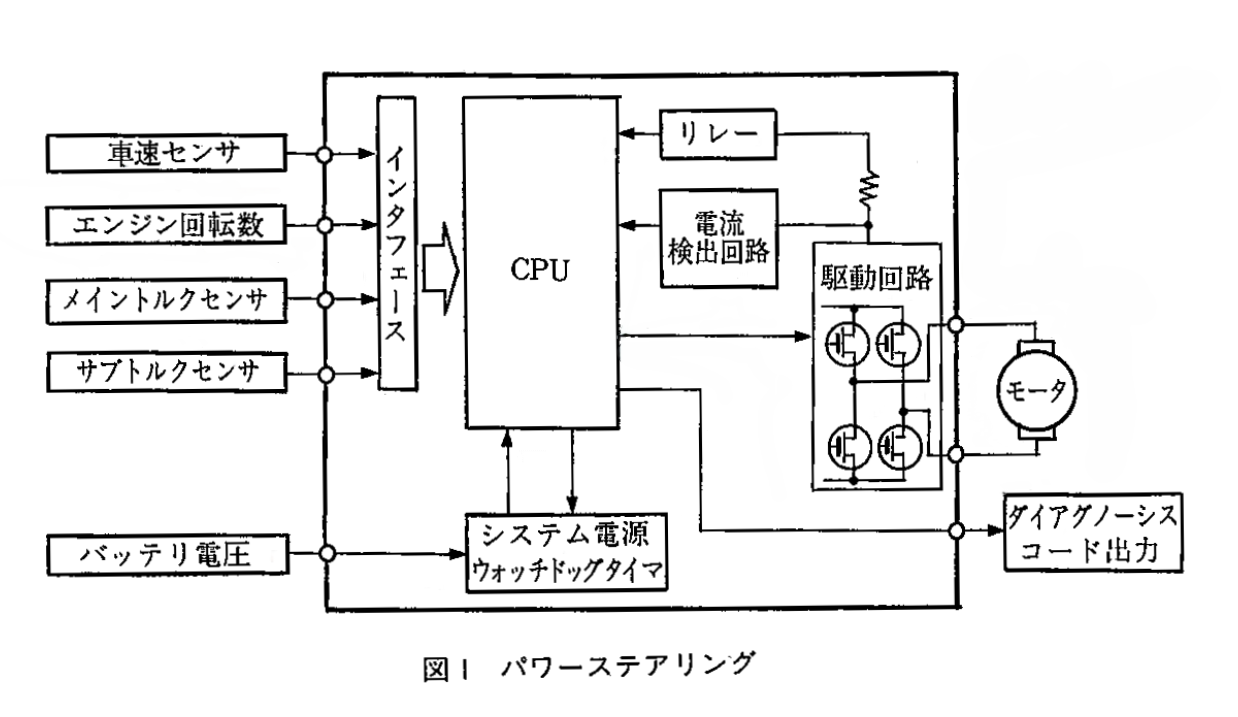 図1は、電動式パワーステアリングのブロック構成例である。エンジンが始動し、システムが通電されると、まずスピードセンサから走行速度が作動範囲内であることが、コントロールユニットに伝えられる。コントロールユニットは、スピードセンサからの信号とトルクセンサからの作動信号を受け、モータとクラッチの制御を行う。