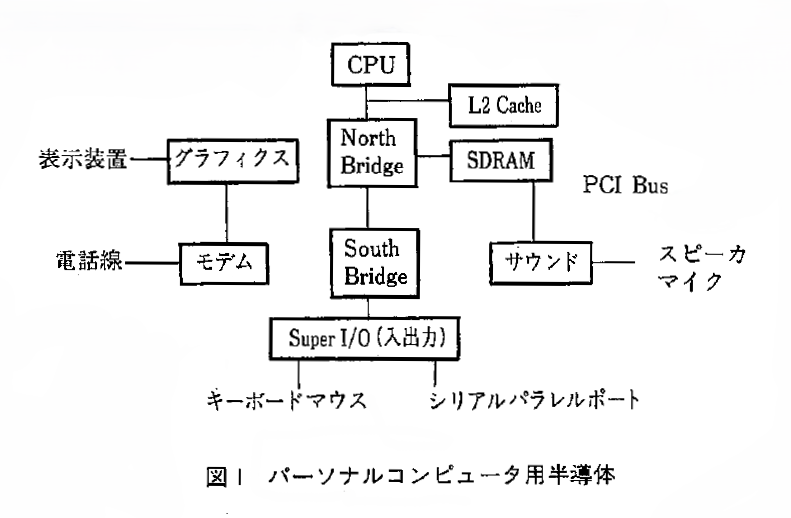 パーソナルコンピュータに使用される半導体としては、CPU、メモリ、入出力インタフェース用LSI(グラフィックス用LSI、サウンド用LSI、モデム用LSI、キーボード・マウス・シリアル入出力用LSIなど)およびこれらを繋ぎ合わせるチップセットと呼ばれるブリッジLSI(現在はPCIバスを基準として、CPU側の“North Bridge"と入出力側の“South Bridge"の2個の構成が多い)などがある(図1)。