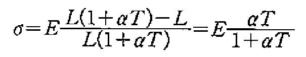 いま具体的な応力として熱応力の場合を考える。長さL、熱膨張係数α、ヤング率Eなる材料の両端を固定し、温度をTだけ上昇させた時に、この棒に生じる熱応力を求めてみる。自由な状態では棒が伸びて L (1 + αT) の長さになるはずであるが、両端が固定されているため棒の長さはLのままである。つまり { L ( 1 + αT ) - L } の分だけ圧縮応力を受けて棒は縮んでいることになる。したがって比例式から、(下記式)