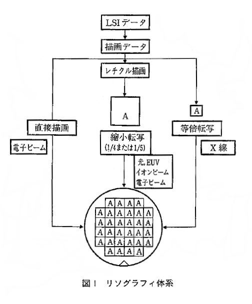 基板上の感光材(レジスト)に回路パターンを形成する技術をリソグラフィと呼ぶ。LSIの製造工程の中で、最も難しいキーテクノロジーの一つである。図1はリソグラフィ体系を示したものである。CADで設計されたLSIデータは、電子ビーム描画装置やレーザ描画装置を用いてレチクルマスク上に4あるいは5倍体でパターン化され、このマスクパターンを光露光装置によりシリコンウェハ上のレジストに1/4または1/5に縮小転写し、現像してレジストパターンを形成するのが、現在最もよく使われる光リソグラフィである。光リソグラフィと同様にマスクを製作してレジストパターンを形成する他の方法としては、等倍マスクを用いた等倍X線リソグラフィ、4倍体のステンシルマスクを用いたイオンビームリソグラフィ、4倍体の多層膜マスクを用いたEUVリソグラフィなどがある。これらはいずれも一括転写方式と呼ばれる。これに対して、マスクを作らずにLSIデータを用いて電子ビーム描画装置の持つパターン創生機能を使って直接ウェハ上のレジストにパターンを形成する技術が電子ビームリソグラフィである。しかしながら、電子ビーム描画装置の低スループットを解消するため、4倍体のステンシルマスクを用いてパターンを一括転写するEBステッパと呼ばれる電子ビームリソグラフィもある。