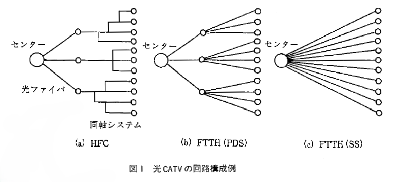 CATVとは、テレビ放送普及の初期にテレビ放電波の届かない地域でテレビを受信するために設置されるようになったCommunity Antenna Television(共同受信設備)の略称であるが、現在では、多チャネルのテレビ番組を有線で家庭に供給するCable Televisionシステムを指すようになっている。これらの施設は同軸ケーブルシステムが中心であったが、施設の高度化に伴って光ファイバの利用が進んでいる。CATVシステムは分配に適した樹枝状網が中心であり、回線を多数で共用するため経費効率のよい回線構成である一方、個々の端末との通信を取り扱う場合、通信容量(特に上り回線)に制約を受ける。光ファイバの利用は、最初は低損失性を利用した長距離伝送、同軸増幅器のカスケード段数の低減による伝送特性の改善などが主目的であったが、昨今ではCATV電話(CATV回線を利用した電話システム)、パソコン通信(インターネット接続サービス)に利用するため、同軸ケーブル部分を500~1,000世帯の規模に絞り、センターと同軸システムを光ファイバで結ぶHFC(Hybrid Fiber/Coaxial)システムとしての利用が主流となっている。今後、通信回線としての容量拡大、VOD(Video On Demand)サービスなどのためには、同軸ケーブル部分の規模をさらに小さくしたFTTC(Fiber to the Curb)、さらには家庭まで直接光回線で結ぶFTTH(fiber to the Home)に向うものと考えられる(図1参照)。
