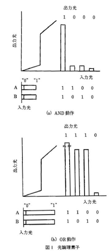 AND、ORなどの二変数の論理演算を実現する方法としては、光入力-光出力間で非線形な特性を示すものがよく使われる。二つの光入力A、Bが入った場合、光出力があるしきい値レベルを越す場合を“1"、しきい値レベルより小さい場合を“0"とすると、光入力A、Bの大きさを調整することによりAND動作あるいはOR動作が実現される(図1)。このように光入出力間で非線形となるような素子は、大別して、光のみで制御動作する純光学型と、系の制御に何らかの形で電気を用いる混成型とに分類される。純光学型ではファブリ・ペローエタロンの透過特性を利用するものが多く、エタロン中に入力光強度によって屈折率や吸収係数が変化する光非線形媒質を入れることで実現される。純光学型の光論理素子では、入力光や制御光で屈折率が大きく変化する三次非線形感受率の大きな材料が不可欠であり、このような材料の候補として半導体超格子や有機材料などに大きな期待が寄せられている。一方、混成型の光論理素子では、光の入出力間のどこかに受光素子を配置し、入力光の一部を電気に変換してこの電気信号を用いて光入出力特性を制御するものが多い。電気的にフィードバックをかけるため、光学非線形効果の大きな光材料が不要となり、既存部品の組み合わせで機能を実現できる利点を有する。