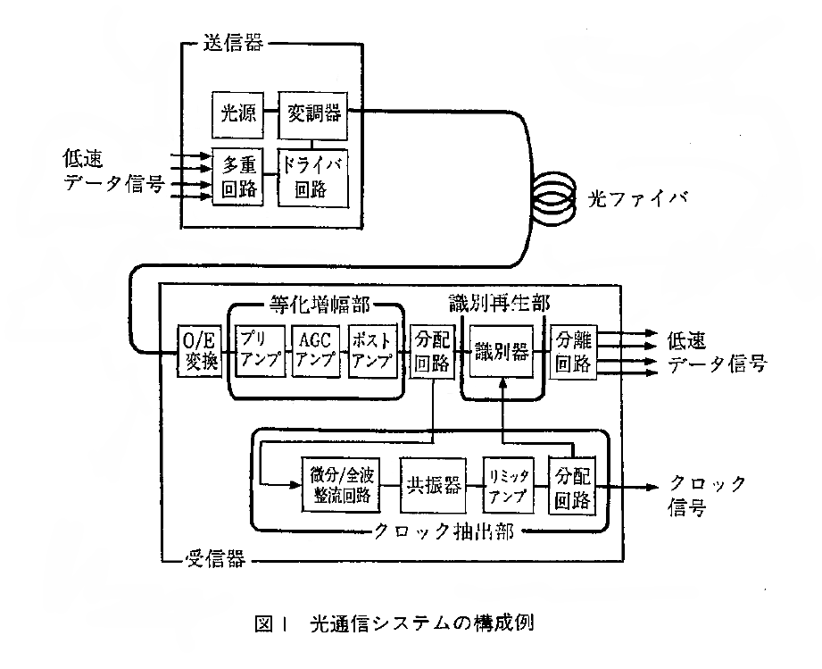 電子回路を用いた時分割多重方式(ETDM : Electrical Time Division Multiplexing)による光通信システムのフロントエンド回路構成の例を図1に示す。送信器は光部品であるレーザ光源と光信号を変調する変調器と、電気部品である多重回路と変調器ドライバ回路により構成される。多重回路は低速並列信号を高速信号に速度変換する機能を有し、変調器ドライバは多重回路の出力信号を受けて変調器を駆動できる電圧まで増幅する機能を有する。受信器は伝送路で劣化した光信号に対して光電気変換を行い識別に適した波形に整形増幅する機能を有する等化増幅部、等化増幅後の信号からクロック信号を抽出するクロック抽出部、等化増幅後の信号を抽出されたクロック信号でパスルの有無を識別し再生する識別再生部から構成される。ファイバ中を伝送された光信号は、フォトディテクタにより光/電気変換された後に等化増幅部に入力される。等化増幅部はプリアンプ(pre amplifier)、AGCアンプ(Auto Gain Control amplifier)およびポストアンプ(post amplifier)で構成される。これらアンプには、伝送レートをカバーできるだけの帯域特性の他に、プリアンプには低雑音特性、AGCアンプには等化増幅部出力を一定に制御するための利得制御機能、ポストアンプにはシステム構成にも依存するが高利得特性が要求される。クロック抽出部の構成には大きく受動共振器を用いる方式と位相同期ループ(PLL : Phase Locked Loop)を用いる方式がある。10 Gbit/sを超えるような超高速システムにおいては、回路構成の簡単な受動共振器を用いる方式が用いられる。しかしながら、低ビットレートのシステムにおいては、受信器の小型化が可能な位相同期ループを用いる方式が用いられており、近年では2.4 Gbit/s程度の伝送レートのシステムにおいても位相同期ループ方式が適用され始めている。受動共振器を用いる方式では図1にあるように、データ信号からクロック信号周波数成分を抽出する微分全波整流回路、微分全波整流回路の出力信号のキャリア成分以外を抑圧する共振器、共振器出力を飽和増幅するリミッティング増幅器により構成される。一般的に長い同符号連続信号に対して安定してクロック抽出可能なように、共振器には高いQ値が、リミッティング増幅器には高ダイナミックレンジ、高飽和出力、低位相偏差が要求される。識別再生部は識別回路により構成され、識別回路により識別再生された信号は分離回路により低速信号に速度変換される。送信器の多重回路も含め識別回路、分離回路には伝送レートで動作可能であることが要求される。さらに、識別回路には高い入力感度特性と広いクロック位相マージンが要求される。