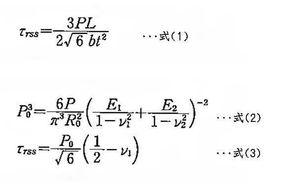 ここで、τrssは分解せん断応力、P₀は最大圧力、Pは自重による荷重値、R₀は球圧子の半径、E₁は基板のヤング率、E₂は球圧子のヤング率、ν₁は基板のポアソン比、ν₂は球圧子のポアソン比である。