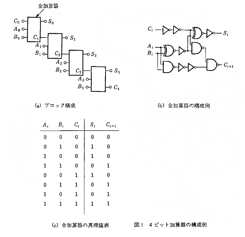 A(A₀、A₁、…)とB(B₀、B₁、…)の加算を行う回路。4ビット加算の構成例を図1(a)に示す。入力Aᵢ、Bᵢと下位からの桁上げCᵢから和Sᵢと桁上げCᵢ₊₁を出力する全加算器から構成される。全加算器の構成例と真理値表を図1(b)(c)に示す。