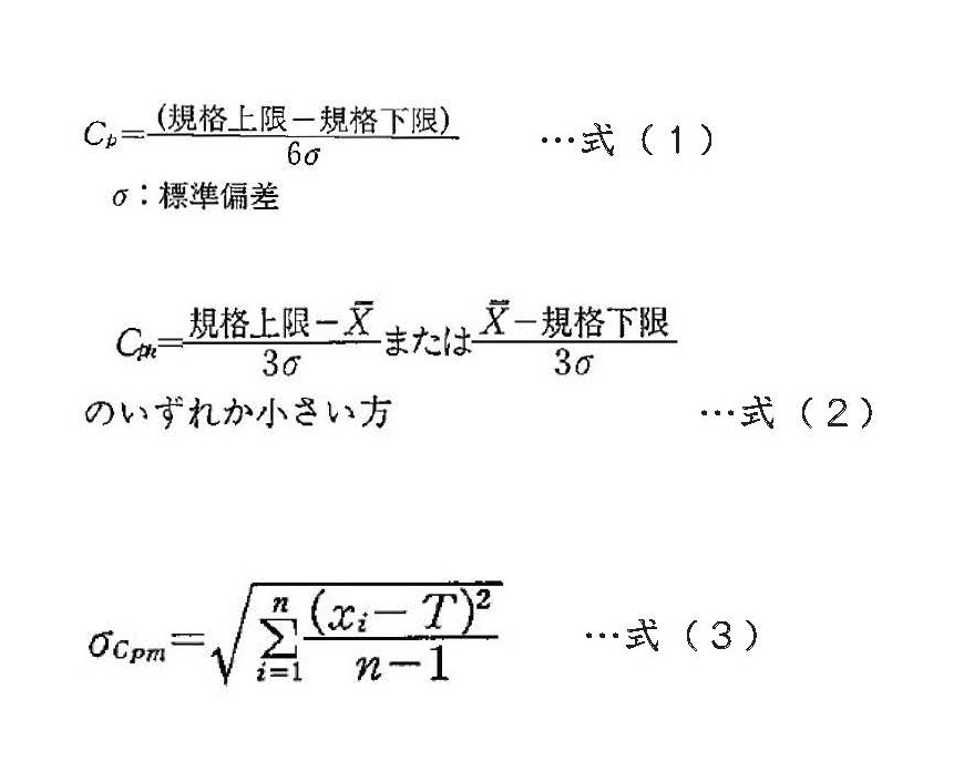 なお、工程能力指数は、この他にもいろいろな計算式が研究されており、クライスラー社、フォード社、ゼネラルモータース社が要求する品質システム規格QS-9000では、平均値からではなく、規格の狙い目Tからのばらつきを考慮したCpmが紹介されている。この場合のσには下記式(3)の値を用いる。