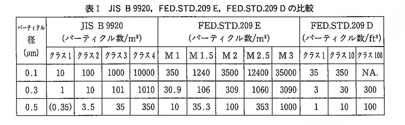 国内の標準であるJISの場合、清浄度はクラス1からクラス8まで区分される。それぞれクラス1は 0.1 µmの粒子が1m³あたり10個(=10¹個)、クラス2では100個(=10²個)、クラス3は1,000個(=10³個)であることを示す。表1は、JIS B 9920、米国の規格であるFED. STD. 209 E(1992年改訂版)、およびその旧版である FED. STD. 209 Dの比較を示す。国内ではクラス1、クラス10などの清浄度を慣例的に用いる場合があるが、これは、FED. STD. 209 Dの表記を使っているものである。
