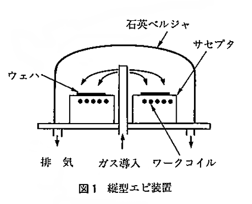 エピタキシャル装置の一種でディスク型、またはパンケーキ型装置ともいう。装置はガス系、反応炉、排気系、制御系より構成されている。反応炉は釣り鐘形状をした石英で、そのまま使用するタイプと、ステンレス製のアウタベルジャと石英製のインナベルジャの2重構造となっているタイプとがある。反応炉は図1に示した構造である。加熱方式は高周波誘導加熱であり、インナベルジャ内部にワークコイルと呼ばれるらせん状に巻かれた銅製角管が設置されている。ワークコイル上には、石英製のワークコイルカバーを介して、CVD-SiCコートカーボン製のディスク形状のサセプタが設置されており、ワークコイルに~35kHzの高周波を流すことでカーボン内に渦電流が誘起され、サセプタが加熱される。均熱はワークコイルとサセプタ間の距離で調整される。ガスは反応炉下部からベースプレートの中心を通って供給され、サセプタ中心からノズルで噴出する。炉形状、ノズル形状、サセプタ回転数、H₂流量などが膜厚分布など、エピタキシャル成長特性に影響を与えるが、相互に関連し合うため、経験的に最適条件を決定している。反応ガスにはSiCl₄、SiHCl₃が主に使用されるが、ウォールデポが少ないため低温成長にはSiH₄も使用されている。