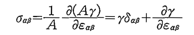 εαβは面内の歪テンソル(結晶表面上の位置γの歪による変位をu(r)とすると、歪テンソルは次式で定義される。εαβ = ∂uβ/∂xα )を、δαβはクロネッカーのデルタ(α = βの時 δαβ = 1、α ≠ βの時 δαß = 0)を表わす。Aとγに対するεαβ微分より第三式が導かれる。単位長さあたりに働く力σαβは、単位面積あたりのエネルギーγと同じ次元を持つことに注意して欲しい。