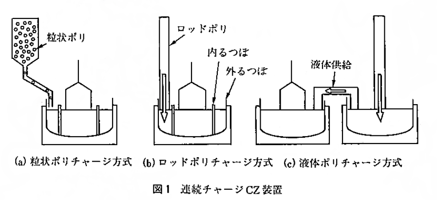 連続チャージCZ装置は、供給原料によって、大きく三つの方式がある。連続チャージCZ装置は、通常のCZ装置と同様の単結晶引き上げ部分と、原料ポリシリコンを供給する原料供給部からなる。基本的には、単結晶の重量変化を計算し、これに見合った重量の原料をほぼ連続的に供給する。このことにより、偏析現象によって、ドーパント濃度が高くなったシリコン融液を新たなポリシリコンで薄める作用が働く。所望の抵抗率に精度よく制御するためには、同時に適量のドーパントを間欠的に供給する必要がある。