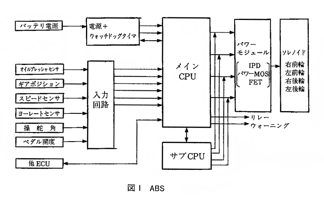 ABSを制御する半導体としては、各種センサより検出された信号を制御するためにマイクロプロセッサ、ソレノイドバルブを起動するために専用のドライブ回路IC、アクチュエータを駆動するためにパワーMOSFETなどが利用されている。