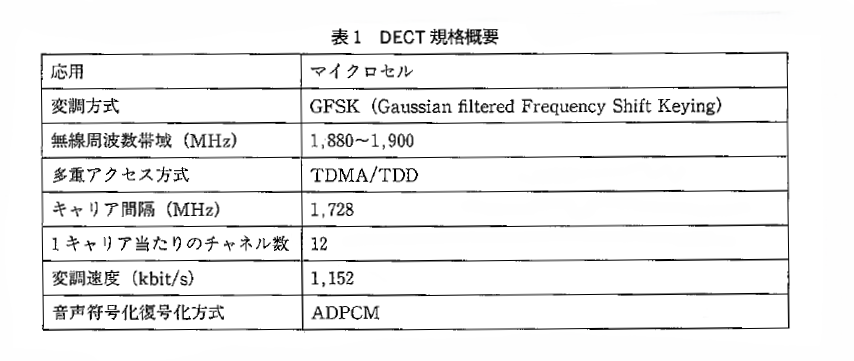 DECTは周波数資源を効率的に利用するマイクロセル無線通信システムである。表1にその規格概要を示す。 DECTは無線アクセス方式としてTDMA(Time Division Multiple Access)とTDD(Time Division Duplex)を使用しており、1台の親機で多数の子機がサポート可能で、かつ子機同士をトランシーバとして使用することも可能である。