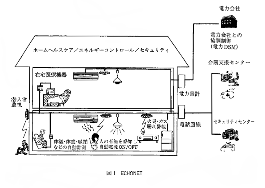 ECHONET(Energy Conservation and Homecare Network)は日本において主として商用電源ライン(他に小電力無線、LAN、赤外線を利用)を経由して、電力会社、医療機関、セキュリティ機関と家庭を接続し、各家庭におけるエネルギー制御、セキュリティの維持、さらに家庭における健康管理(ホームヘルスケア)などを図ることを目的としたネットワークシステムであり、松下電器産業、東芝、日立、三菱といった家電機器メーカーおよび東京電力、日本ガス協会、NTTなどエネルギーおよび通信に関連する諸メーカー、団体が同コンソーシアムに加盟している。