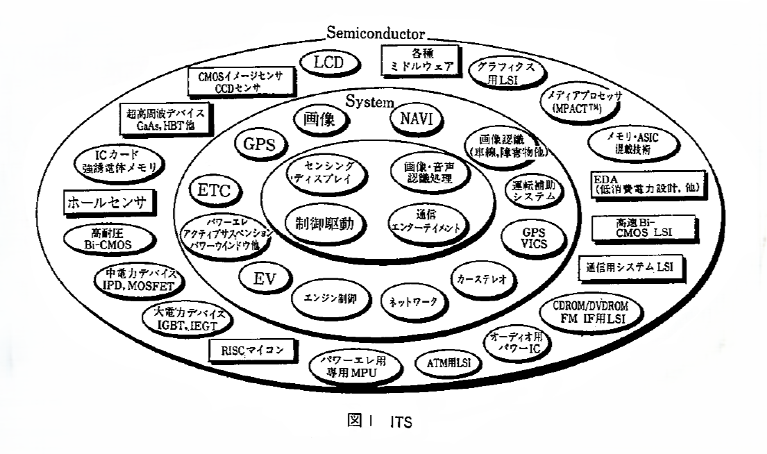 また、関連する要素技術としてはセンサ技術、情報・通信技術、画像・音声処理技術、制御技術、ディスプレイ技術などがあげられるが、それらのすべてに半導体が利用されており、特に各種センサ、高周波トランジスタ、レーザダイオード、画像・音声処理用システムLSI、高位マイコンがキーデバイスとなっている。ITSの範疇に入る具体的なシステムとしてETC(Electronic Toll Collection System)、VICS(Vehicle Information and Management Systems)、AHS(Advanced Cruise-Assist Highway Systems)、ASV(Advanced Safety Vehicle)などがある。