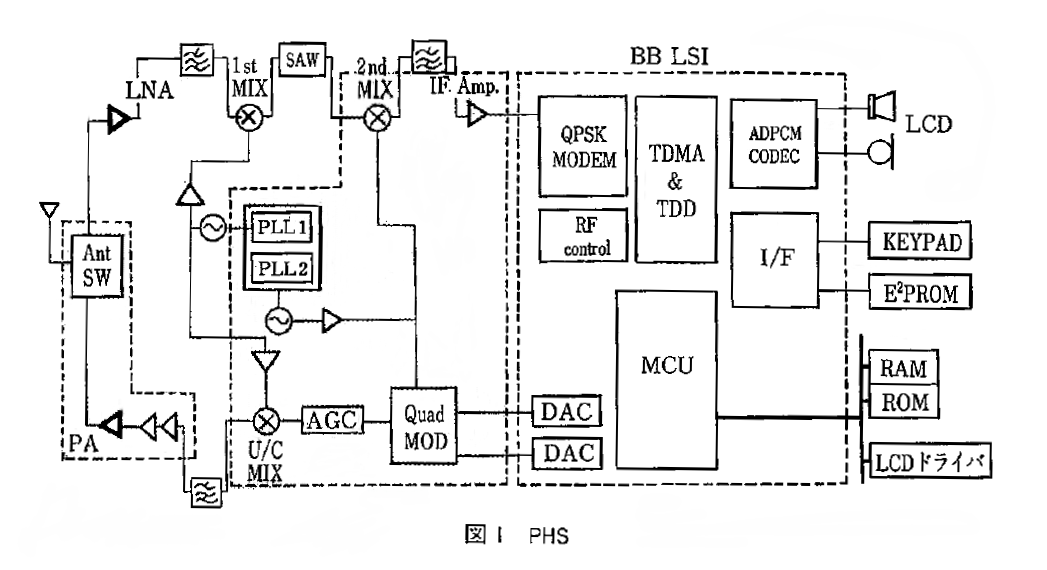 PHS端末は、1.9GHzの高周波信号を送受するRF部と、音声信号を処理し通信手順の制御をするベースバンド部の2ブロックから構成される。RF部の中心は、信号処理の基準となるPLLシンセサイザである。受信系を構成する半導体は、LNA、ミキサ、IFアンプである。送信系は、IF変調、ミキサ、パワーアンプ、アンテナスイッチから構成される。RF部の小型化のため、PLL・IFアンプ・IF変調・送受ミキサは、Bi-CMOSプロセスにより1チップに集積化されている。パワーアンプ・アンテナスイッチ・LNAも、GaAsかバイポーラプロセスで1チップ化されている。
