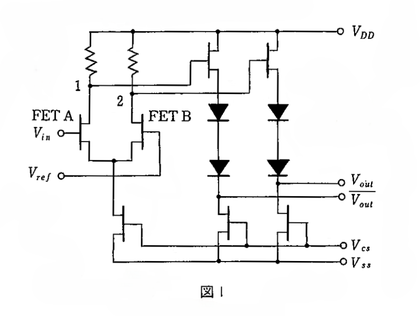 SCFLは差動回路であり、出力は二つの入力の差分(図1のVin-Vref)でのみ決定する。したがって、FET差動対のしきい値のばらつきによる出カヘの影響は軽微であり、FETばらつきに強い回路構成といえる。また、出力は論理ゲートの論理結果とその否定の2種類がえられるので、その差分を次段SCFL論理ゲートの入力として使うことができる。