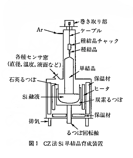 Si単結晶育成装置は、融液を保持するためのヒータと保温部材が接地してある下部と、引き上げた結晶を収納する上部で構成されている。SiOの適正な排出と炉内の圧力を制御するために、上部から、Arを流し、下部から真空ポンプで排気を行う。融液の温度制御は、液面温度や、保温部材側面をモニタし、ヒータ出力にフィードバックする。結晶の直径制御は、CCDカメラなどによって計測し、引き上げ速度にフィードバックする。また、より高品質な結晶を製造するために、液面位置をレーザで検出して、一定の位置に制御する方法や、炉内圧力、結晶回転速度やるつぼ回転速度を結晶の成長長さに応じて変化させるなど、いくつかのパラメータを組み合わせて、所定の品質の結晶をえる。